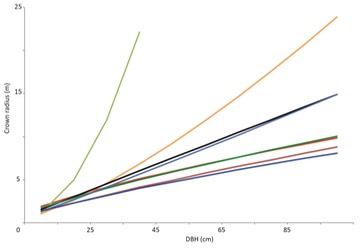 Allometric relationships between adult DBH and crown radius for the eight tree taxa
